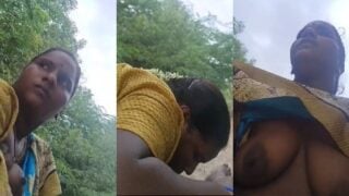 साउथ इंडियन मल्लू रंडी ऑन्टी जंगल मे अपने जवान आशिक के साथ सेक्स का मजा ले रही है. बडे बूब्स वाली ये रंडी ऑन्टी जंगल मे अपने प्रेमी के साथ मजे कर रही है. पिली साड़ी ने सजी ऑन्टी अपने प्रेमी के पास बैठ उसके लंड को मुठ मार रही है वही उसका प्रेमी ऑन्टी के बडे स्तन को दबाता है. फिर ऑन्टी लंड के ऊपर झुक लंड को चूसने लगी. ऑन्टी ने लंड को चूसकर जब लंड को टाइट कर दी तो वो उठके अपनी साड़ी को ऊपर उठाती है और लंड के ऊपर बैठ जाती है. फिर अपने लटकते बडे स्तन को हिलाते हुए ऑन्टी लंड की सवारी करते हुए अपने प्रेमी को चोदने लगती है. गाँव की सेक्सी ऑन्टी का चुत तो हमें सही से नहीं दीखता लेकिन लंड पे सवार होती ऑन्टी के बडे बूब्स के नज़ारे बखूबी मिलते है.